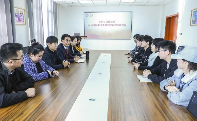 艺术与传媒学院在图书馆5楼会议室举行2026届本科生赴陕西卫视毕业实习欢送会,陈敏直院长首先代表学院向顺利获得陕西卫视实